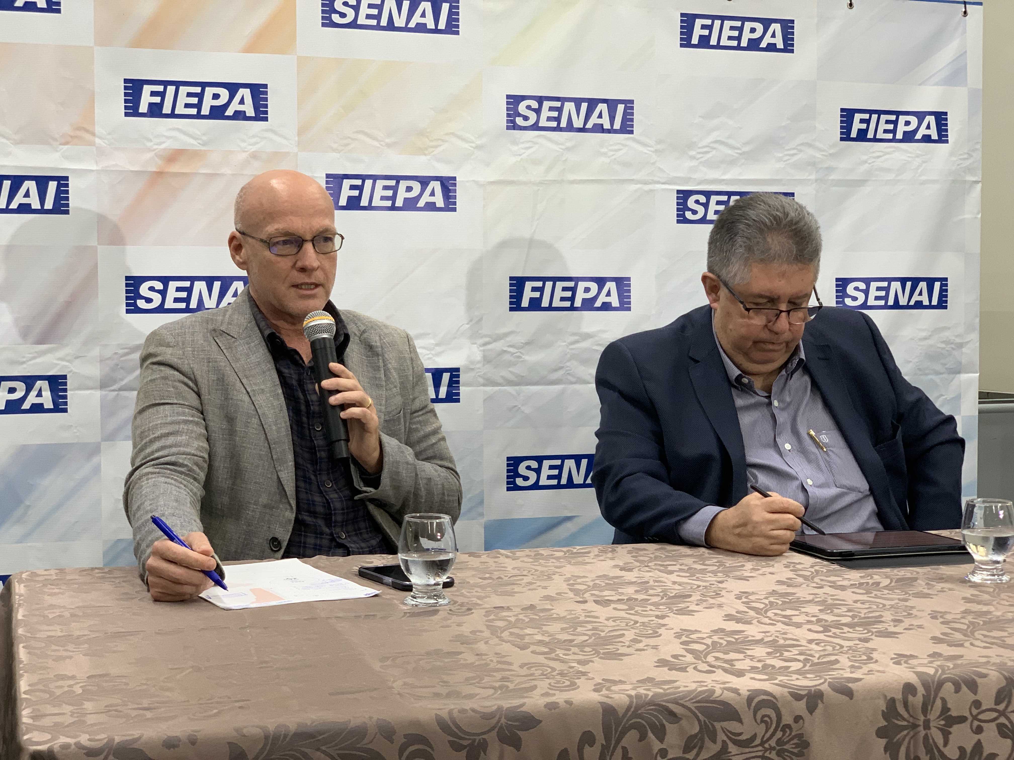 O Presidente do Sindicato da Indústria da Construção do Estado do Pará (Sinduscon-PA), Alex Carvalho, ao lado do Diretor Regional do Serviço Nacional de Aprendizagem Industrial no Pará (SENAI-PA) e Superintendente Regional do Serviço Social da Indústria no Pará (SESI-PA), Dário Lemos, participou na tarde da última segunda-feira, 23, no Senai Getúlio Vargas, em Belém, de entrevista coletiva sobre a divulgação dos dados e avaliação do Mapa do Trabalho Industrial 2022-2025, estudo realizado pelo Observatório Nacional da Indústria para identificar demandas futuras por mão de obra e orientar a formação profissional de base industrial no País.